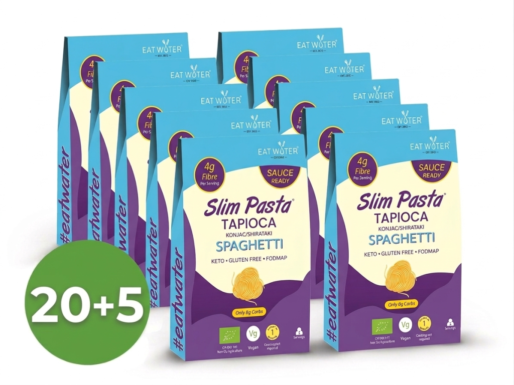 Tapiokovo-konjakové prílohy v tvare špagiet – Slim Pasta druhej generácie – majú o 90 % kalórií menej ako bežné špagety. Sú hotové za jednu minútu. Nevaria sa, nepreplachujú sa, neplávajú v náleve. Nemajú arómu. Sú nízkokalorické. Skvelé pre vašu redukčnú diétu. Vhodné pre vegánov. Bez lepku. Obsahujú vlákninu.